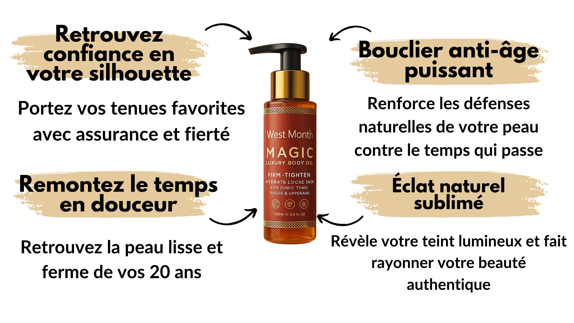 L'huile corporelle rajeunissante de West Month est LE produit que je recommande les yeux fermés. J'ai vu des femmes de 45 ans retrouver la peau de leurs 30 ans.